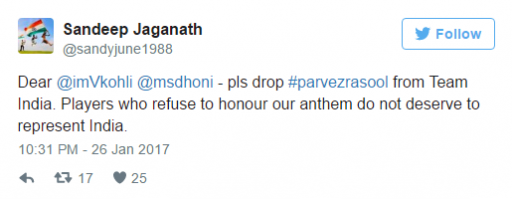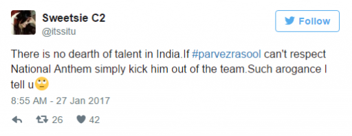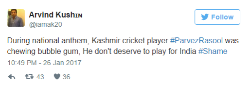 پرویز رسول نے میچ سے پہلے بھارتی ترانے کا احترام تو کیا اور وہ اس دوران کھلاڑیوں کے ساتھ کھڑے بھی رہے مگر مسلمان ہونے کے باعث اس دوران ان کے چیونگم چبانے کو سخت تنقید کا نشانہ بنایا جا رہا ہے