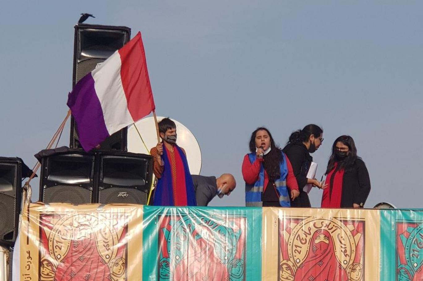 عصمت رضا کے مطابق: ’ہمارے پرچم میں شامل رنگوں کو علامتی طور پر شامل کیا گیا ہے۔ اس میں سرخ رنگ انقلاب، سفید رنگ امن جبکہ جامنی رنگ فیمینزم کی علامت ہے۔‘