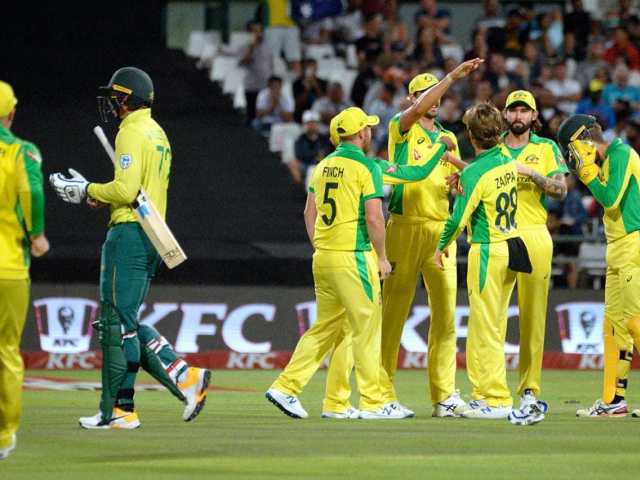 کیپ ٹاؤن :جنوبی افریقی کرکٹ ٹیم ہوم گراؤنڈ پر مسلسل چوتھی ٹی 20 سیریز ہارگئی۔گزشتہ سال مارچ میں ہوم گراونڈ پر سری لنکا کو ہرانے والی پروٹیز ٹیم کا پورا سال ناکامیوں میں ڈوب گیا.ورلڈ ٹی 20 سے محض آدھا سال قبل کرکٹ جنوبی افریقا کیلئے تشویشناک صورتحال ہےجب بدھ کی شب ہوم میدان میں وہ 5 دن کے اندر اندر دوسری بڑی عبرتناک شکست سے دوچار ہوگئی۔کیپ ٹاؤن میں آسٹریلیا نے تیسرے و فیصلہ کن میچ میں 97رنز کے بھاری مارجن سے میدان مارلیا اور سیریز 2-1سے اپنے نام کرلی.مہمان ٹیم نے ایرون فنچ اور ڈیوڈ وارنر کی 120 رنز کی اوپننگ شراکت کی مدد سے مقررہ 20 اوور ز میں 5 وکٹ پر 193 رنزبنائے.وارنر نے 57 اور فنچ نے 55 کی اننگز کھیلیں. جواب میں پروٹیز بیٹسمین 16ویں اوور میں 96 پر ہتھیار پھینک گئے. ڈوسین 24 رنز کے ساتھ نمایاں رہے 7 کھلاڑی ڈبل فیگر کو بھی نہ پہنچ سکے .آشٹن اگر اور مچل سٹار ک نے 3، 3 وکٹ لیں. مچل سٹارک میچ اور فنچ سیریز کے بہترین کھلاڑی قرار پائے.