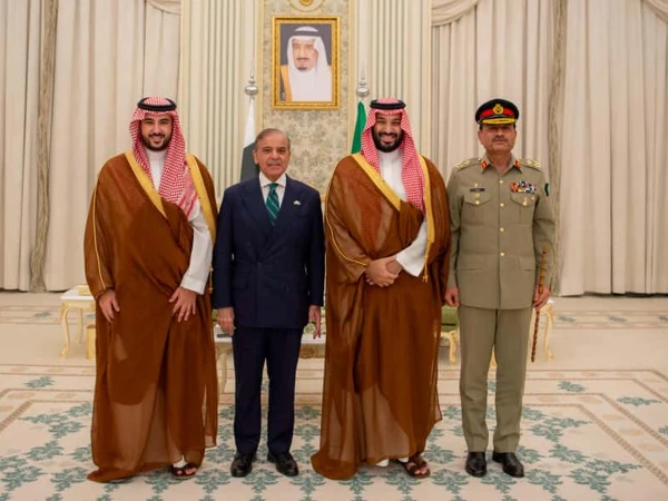 ولی عہد شہزادہ محمد بن سلمان کی دعوت پر وزیراعظم شہباز شریف مملکت سعودی عرب کے سرکاری دورے پر اسلام آباد سے ریاض پہنچے جہاں سعودی F-15 لڑاکا طیاروں نے وزیراعظم کا شاندار استقبال کیا، دونوں رہنماؤں نے دفاعی معاہدے پر دستخط کردیے جس کا مقصد پاکستان اور سعودی عرب کی خودمختاری و سالمیت میں ایک دوسرے کا ساتھ دینا ہے۔