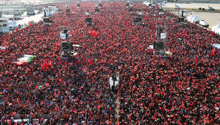 اسرائیلی جارحیت اور مظالم کے خلاف ترکیہ میں ریلیاں نکالی گئیں، استنبول میں اسرائیلی جارحیت کے خلاف بڑی احتجاجی ریلی نکالی گئی جس میں ہزاروں افراد نے شرکت کی، ترک صدر رجب طیب اردوان نے ریلی سے خطاب کرتے ہوئے مغربی ممالک کے دوہرے معیار پر کڑی تنقید کی اور کہا کہ آپ یوکرین میں مرنے والوں کے لیے آنسو بہاتے ہیں، لیکن آپ غزہ کے بچوں کے لیے آواز کیوں نہیں اٹھاتے؟